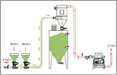 工作過程:開啟負壓引風機,將吸料管放置需要輸送的物料中,設備開始吸料,通過脈沖收塵器,將物料收集,排放到料倉。
